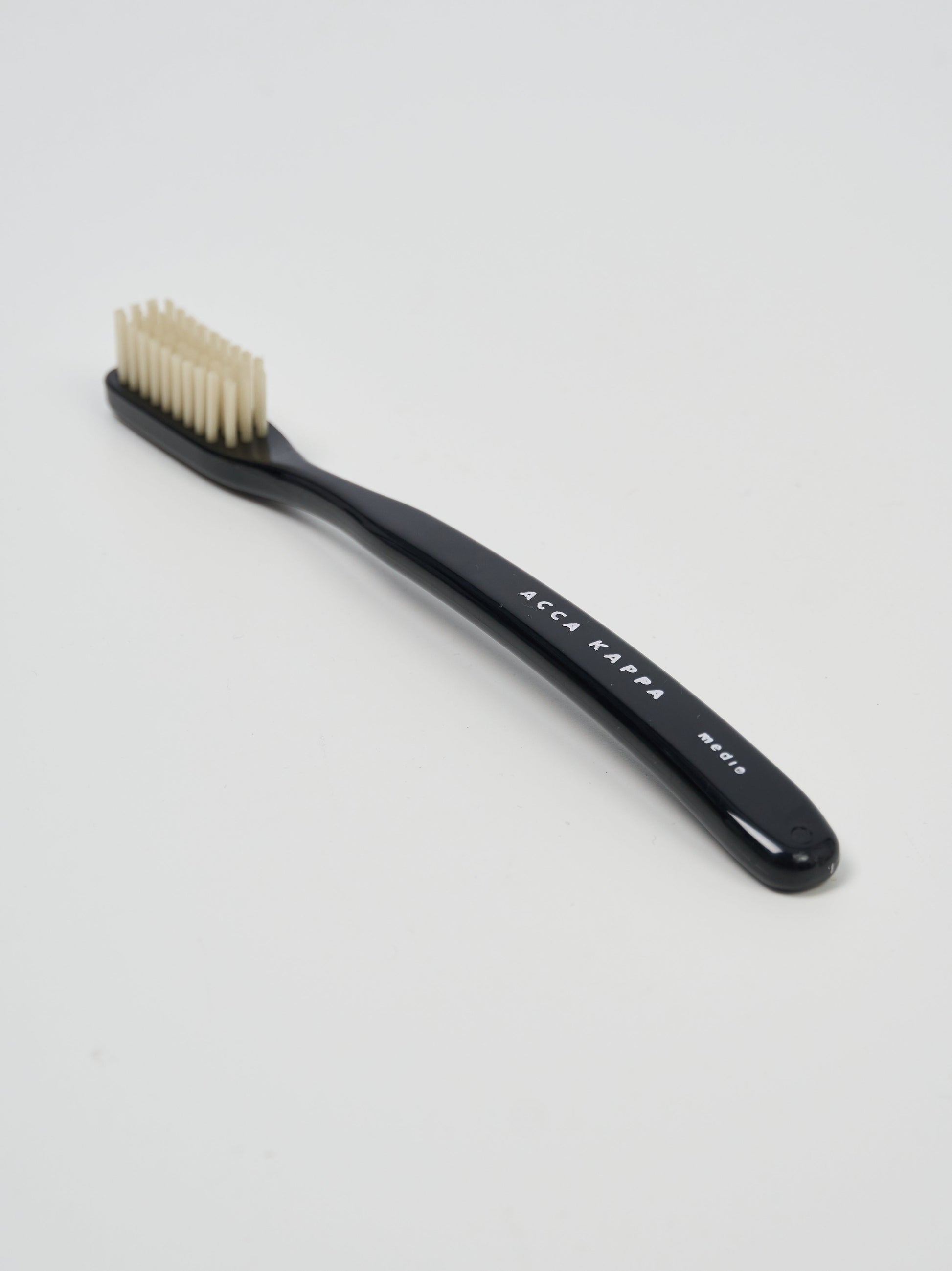 The Acca Kappa Toothbrush in Black reflects the precision and care of Italian brushmaking. Each handle is hand-cut, milled, and shaped from smooth cellulose acetate, polished to a deep black finish that feels timeless and refined. The medium nylon bristles are rounded at the tips to protect enamel and gently massage the gums, providing a balanced clean that is both thorough and comfortable. Designed with subtle curvature for ease of grip, it brings quiet intention to a daily ritual.