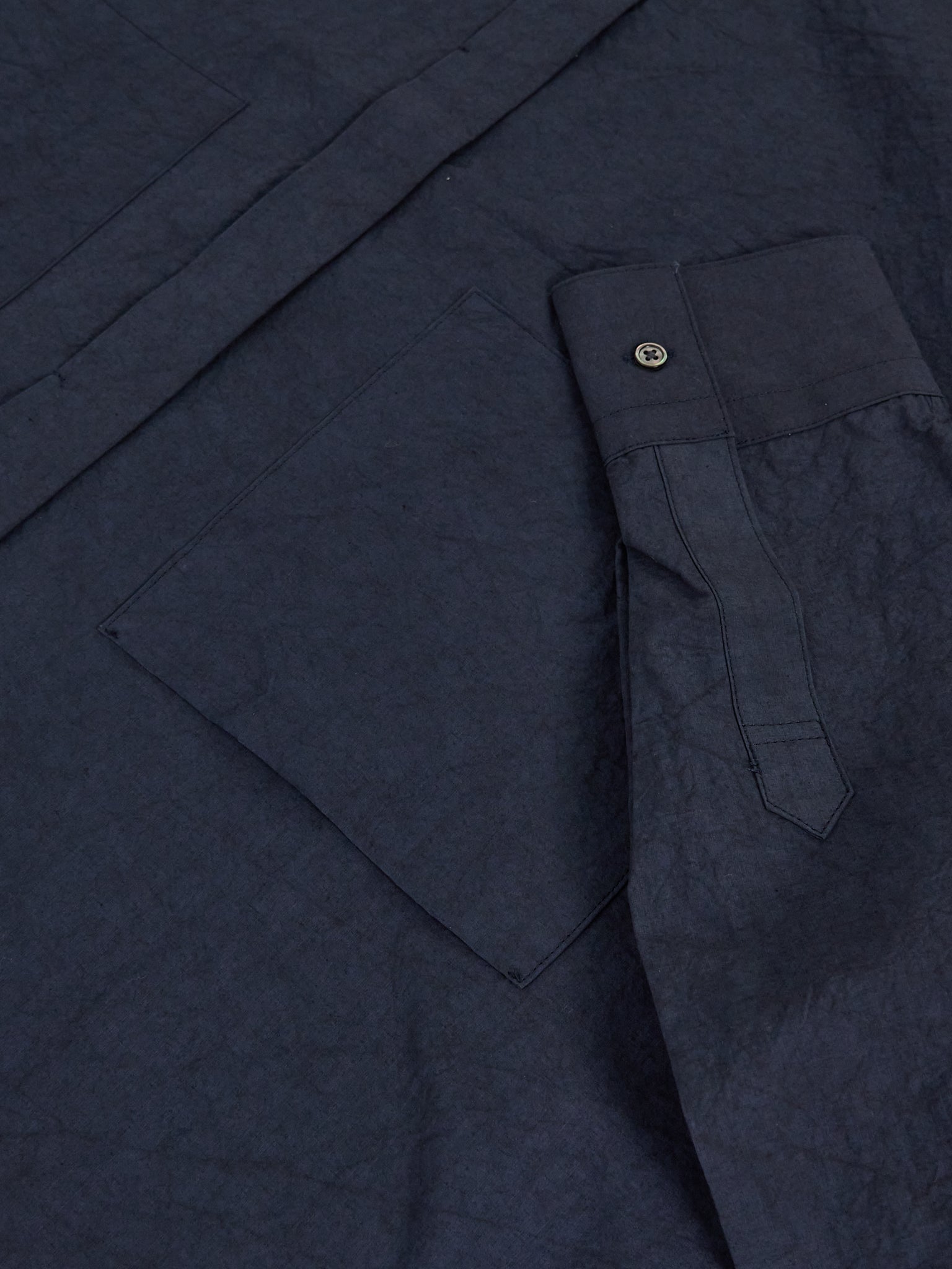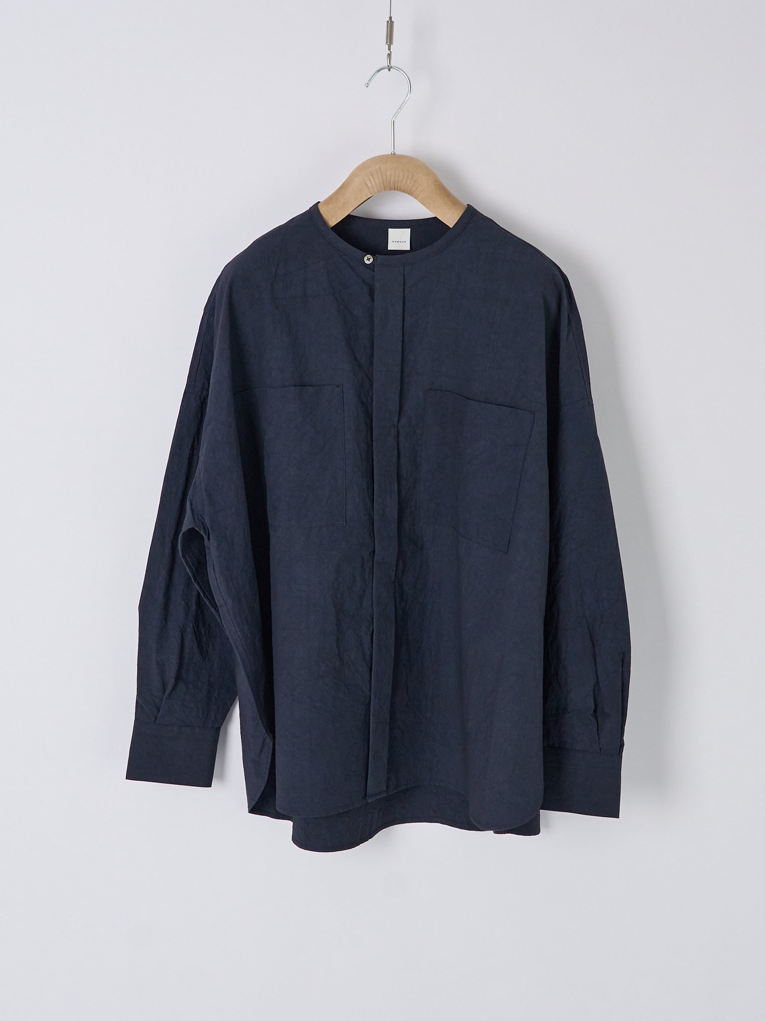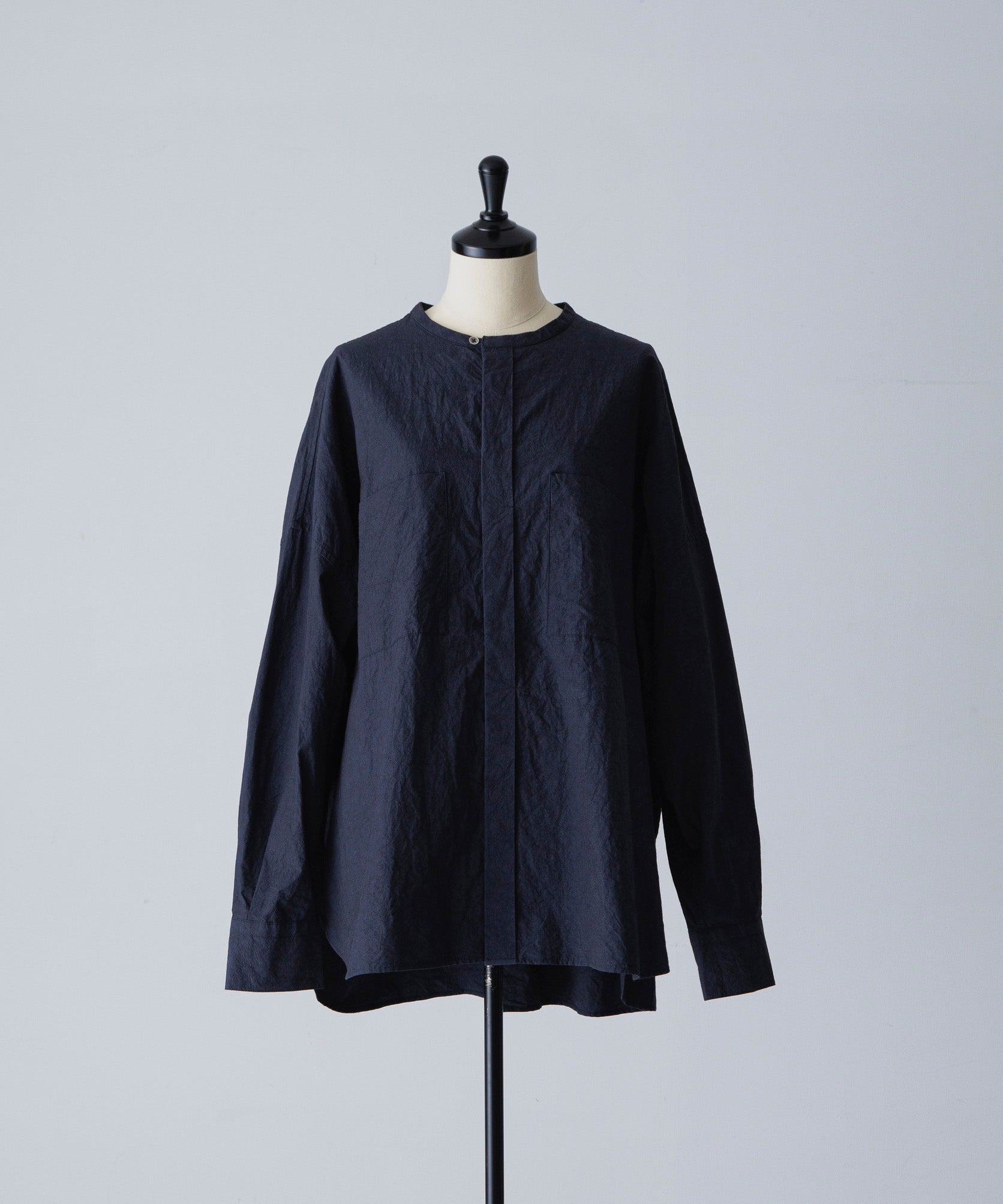 A relaxed, collarless shirt cut in a wide silhouette with double front pockets. Crafted from Enshu-dyed cotton-linen - a textile developed in Japan’s historic Enshu region, known for its specialist dye houses and depth of colour - the fabric offers a soft hand feel with gentle tonal variation and natural texture.