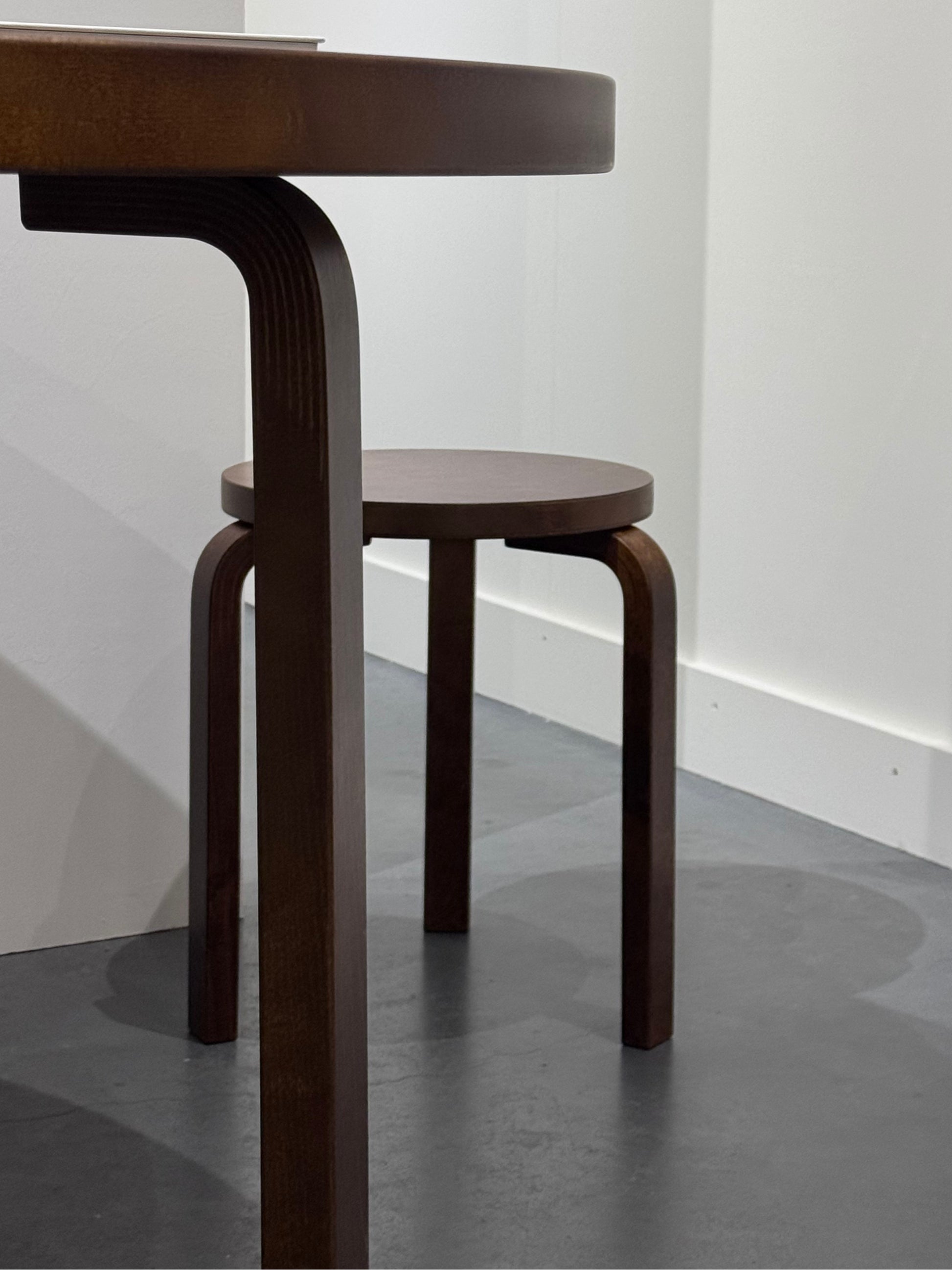 Designed by Alvar Aalto in 1933, Artek’s three-legged Stool 60 shows how honest material and clear proportion can serve daily life. The birch structure uses Aalto’s L-leg for strength and precise stacking, and the walnut stained finish lends a warm, grounded tone that suits living spaces, kitchens, and workrooms. The stool moves easily between roles, a seat for guests, a side table, a bedside surface, or a small display for books and objects. Produced in Finland and delivered flat for efficient transport, it assembles simply and is made to last. A considered object that earns its place through use. Keywords: Artek Stool 60, Alvar Aalto stool.